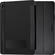 The React Series Folio case protects the Samsung Galaxy Tab from drops, and the transparent window on the back allows for easy identification of engravings and device markings. The microfiber lining of the folio case protects the display, and the elastic band keeps the case closed while in a bag or during charging in the charging case. The case features a stand (folio) with two positions for typing and viewing, as well as a cutout for secure attachment of the Samsung S-Pen.