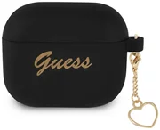 GUESS Silicone Charm Cover. The silicone case protects Apple AirPods wireless headphone docking station from surface damage and possible loss. The high quality silicone case fits perfectly into the original AirPods case and is extremely pleasant to the touch. The case is distinguished by the gold Guess logo in Vintage style, in addition, there is a gold pendant on the side which makes the case takes on an elegant style.