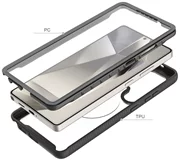 The case consists of two components: a frame that wraps around the edges of the phone with an integrated 5H hardness hybrid glass, and a hybrid armour that is worn on the back of the device.