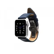 Monowear leather strap in blue color with matte aluminum adapters and silver butterfly clasp. The durable Saffiano leather finish and perfect processing will raise your Apple Watch to haute couture style.