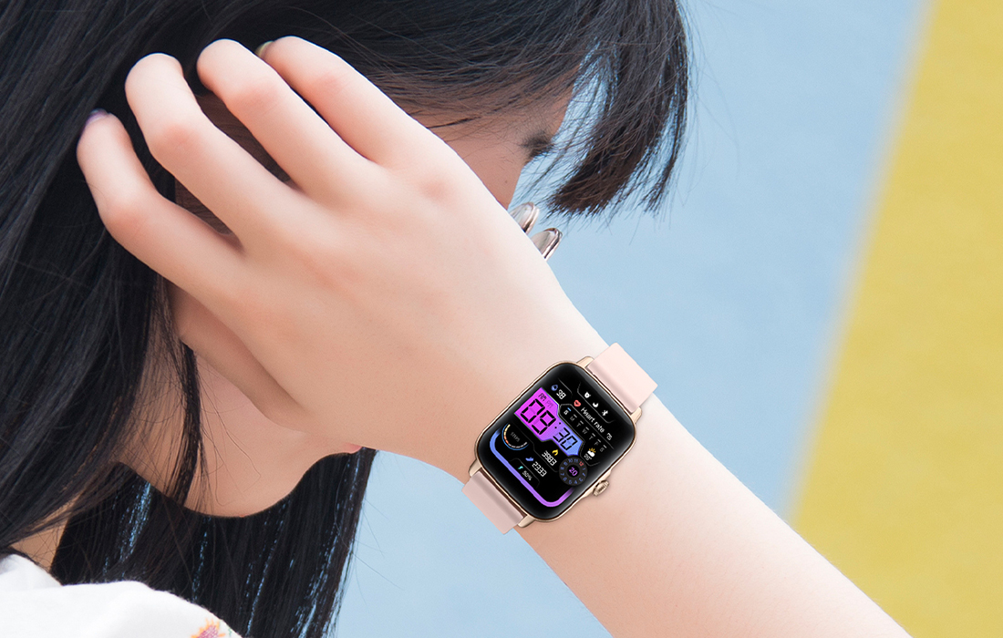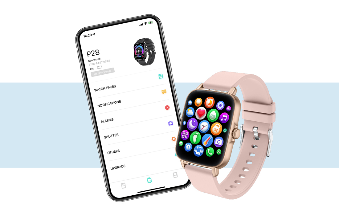 What makes using a smartwatch so easy and fun? The P28 is equipped with a touchscreen display as large as 1.69″, which provides convenient access to all useful functions and guarantees a clear image in almost any conditions. You can also customize its appearance to suit your preferences, styling or mood. With over 100 screen designs available, you are sure to find one you like!